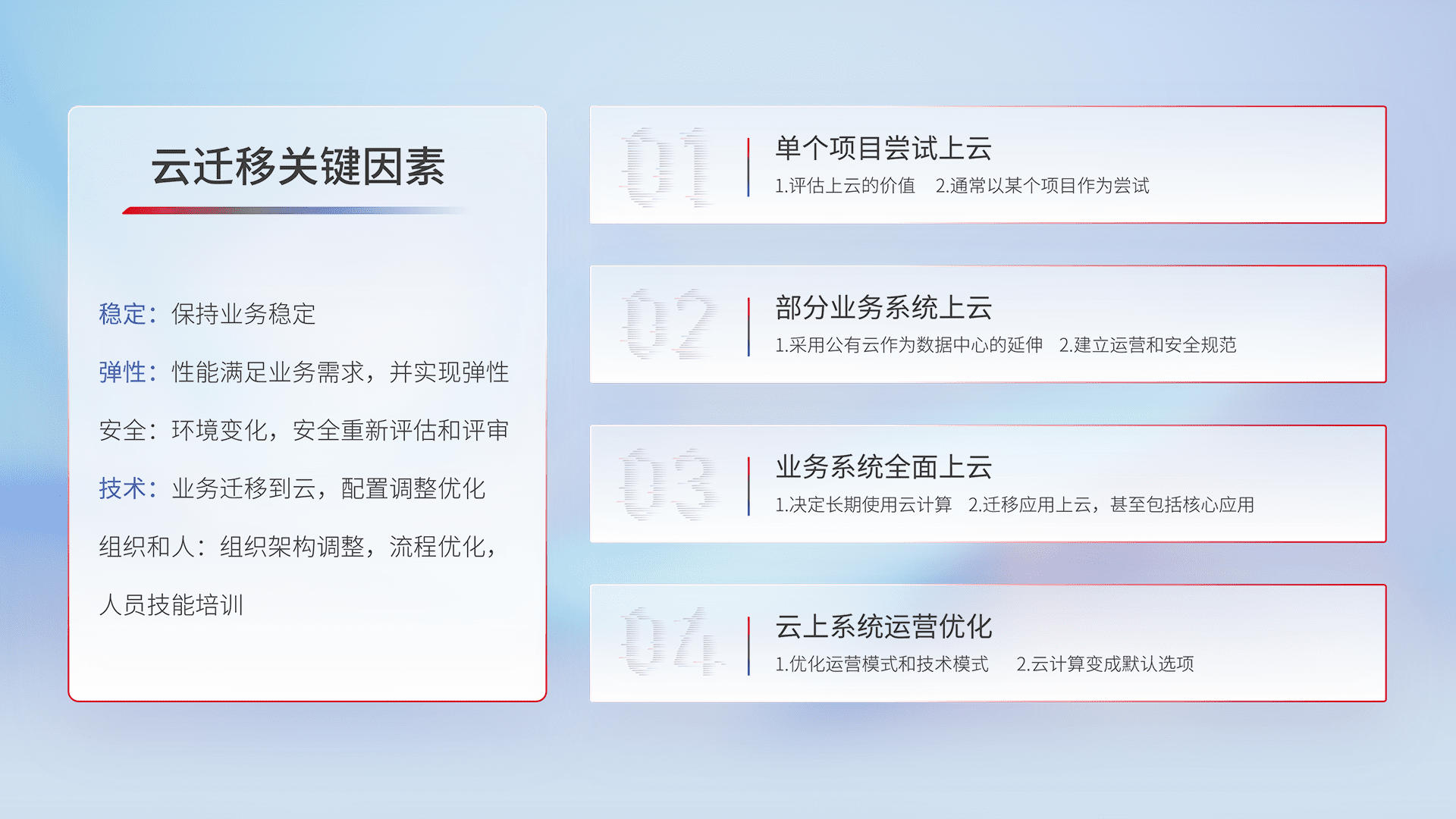 结合实际业务,,,,从规划设计、、、云平台选型、、、云原生改造、、数据迁移、、集成交付,,迁移全过程为客户识别最佳上云路径,,,,做好风险识别管理,,,设计网络架构、、身份权限、、安全审计合规、、操作审计、、、日志审计、、监控告警策略、、、、多站点容灾设计等,,,,对云上基础设施进行整体规划,,,,提升IT治理水平,,,,以满足弹性、、、高可用、、、高性能的需求。。。。