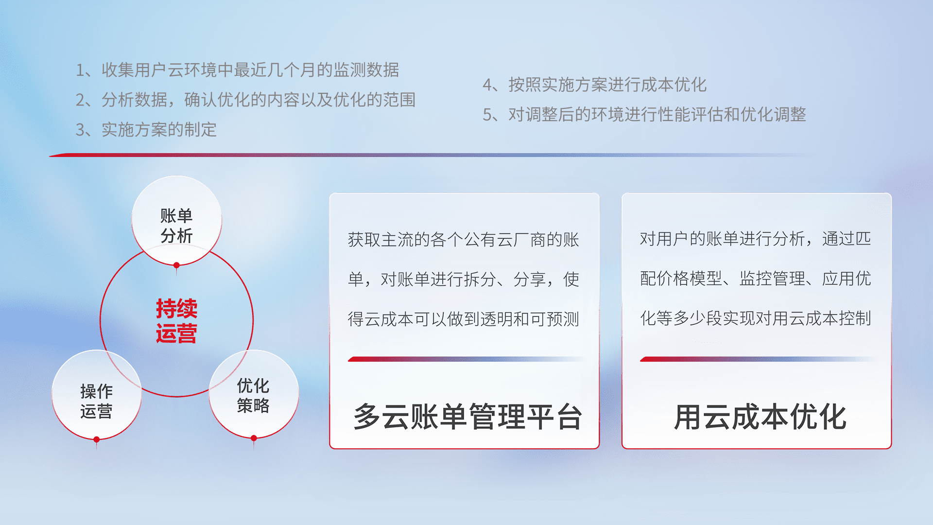 通过多云纳管,,,,以统一的资源数据模型把客户的云资源进行抽象和封装,,,进而实现对多云资源的统一操作,,保障云资源管理的可靠性、、、稳定性与可用性。。。量身定制化运维内容,,,配置、、开发运维、、、、补丁管理、、备份、、、、监控、、认证和访问管理、、审计和日常巡检等,,保障在用云过程中的可靠度,,,稳定度以及高可用率。。。